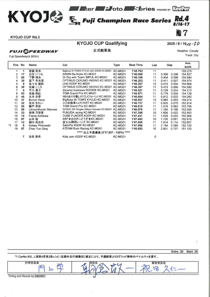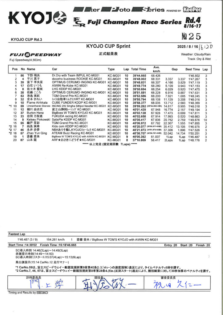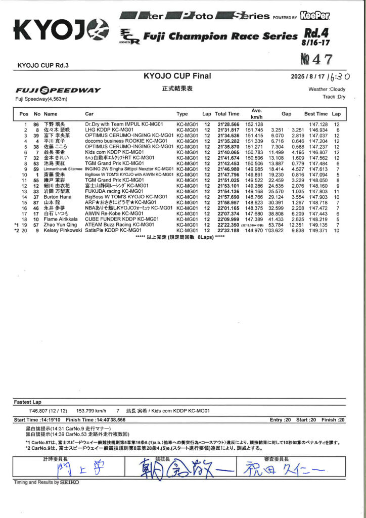スタートは土曜日と同じく蹴り出しよくスタート出来ました。5番手のままAコーナーから100Rまでいき前との距離が近くチャンスができました。100Rで前の車のアウト側から仕掛けて、ヘアピンでイン側からパスすることが出来ました。オープニングラップは4番手で1周を迎えました。その後2周目の最終コーナーの立ち上がりを考えて、スリップが効く距離まで付けられました。3周目の1コーナーをアウト側から仕掛けて、そのまま立ち上がり、Aコーナーでイン側を取り、3番手に上がる事が出来ました。中盤は前の車よりペースがある事が分かったので、落ち着いて自分の今持ってる走りを出せるように意識しました。そして1コーナーで2番手の車をイン側からパスすることが出来ました。その時点で総合2位につけていました。トップとは結構離れてしまいましたが、終盤が始まったあたりはトップよりもペースがあったので追いついて、スリップが効く所までいきたいと思いました。ですが、最初に開いてしまった差が大きく、中々詰まらずそのまま単独での走行になりました。FinalレースではSCや赤旗が出ず、終始クリーンな形で終われたかなと思います。最後の最後でファステストを更新されてしまいましたが、ペースは今までよりも良かったと思います。