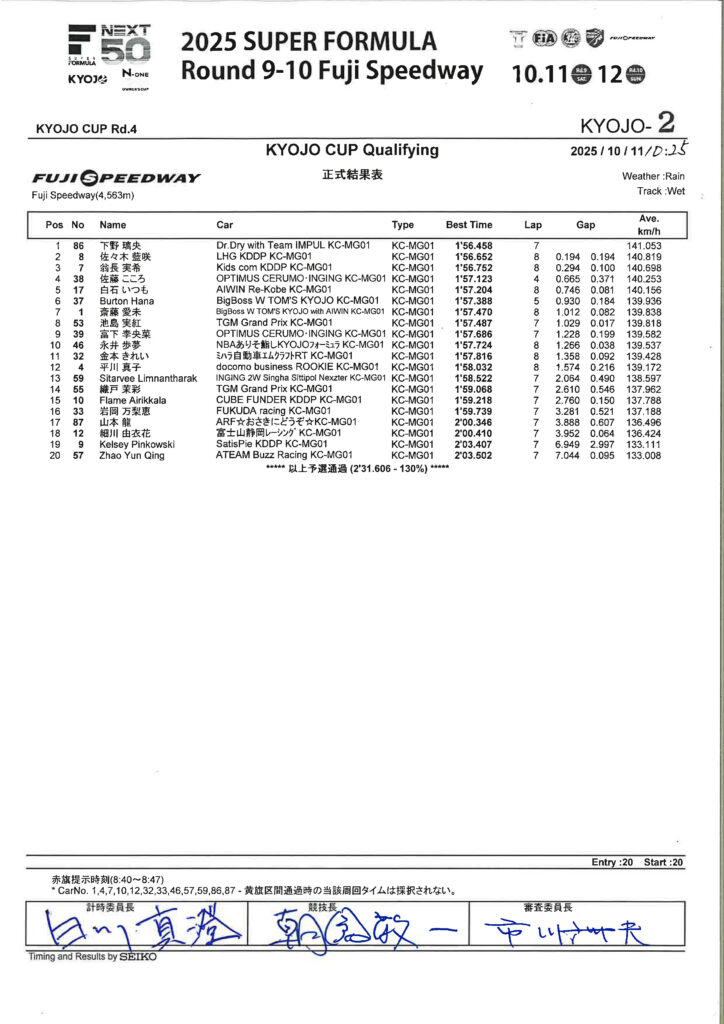 同日の午後、Sprintレースが行われ予選と同じくレインコンディションとなりました。グリッドはフロントローの2番手スタートからとなりました。今まで出場してきたKYOJOレースでは初めてのフロントロー獲得となりました。Sprintレースは雨量が多かった事もあり、SCスタートになりました。そのため、SCラン3周からの7周のレースになりました。SC解除後、前にいたトップの車に離されないようについていきましたが、タイミングを合わせられず少し離されてしまいました。